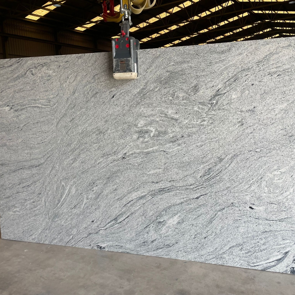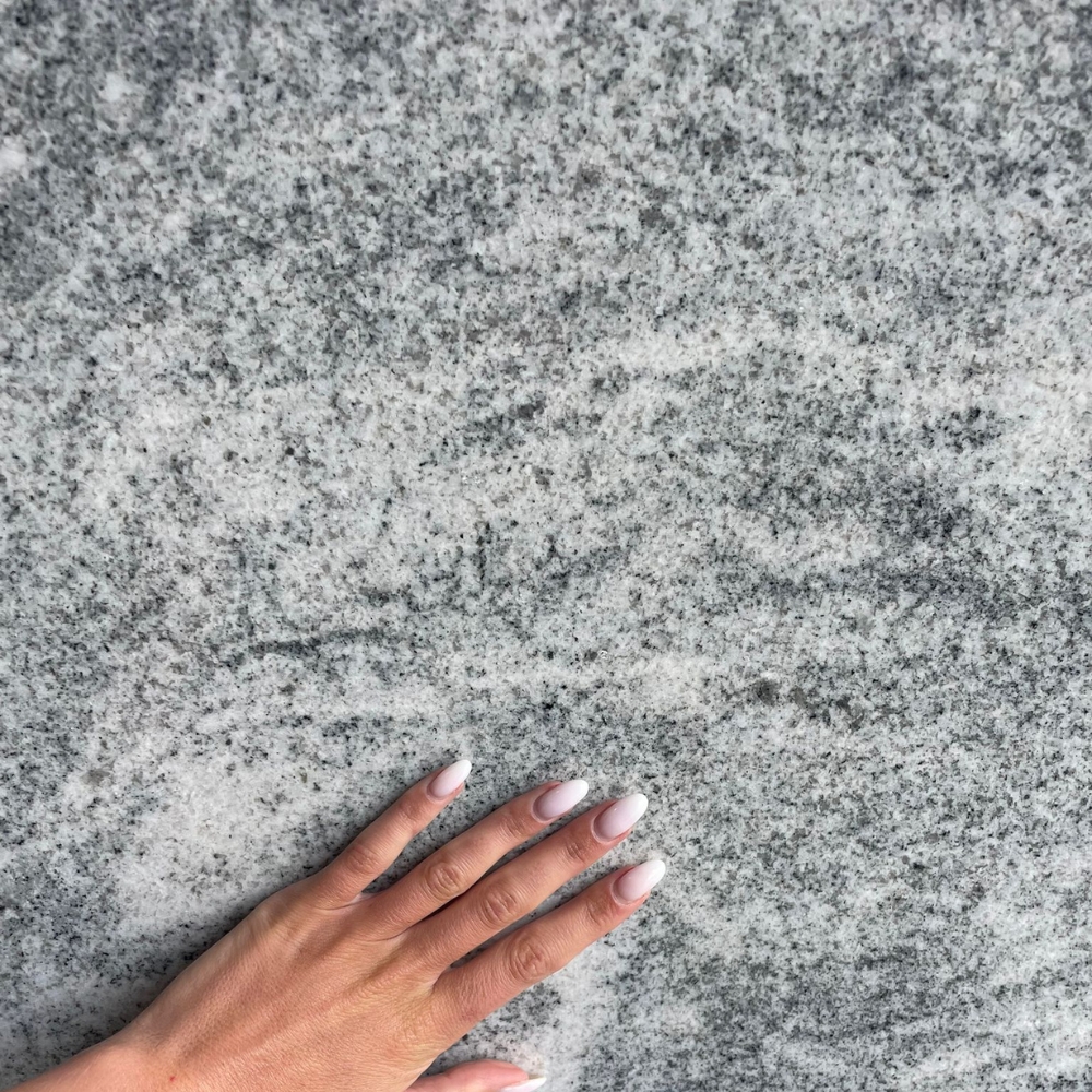 El Viscon White es un granito de apariencia elegante y fluida, con un fondo gris plateado atravesado por ondas más oscuras que generan movimiento y profundidad. Su diseño equilibrado y luminoso lo convierte en un material muy versátil, perfecto para encimeras, revestimientos o suelos que buscan un acabado moderno y sofisticado.